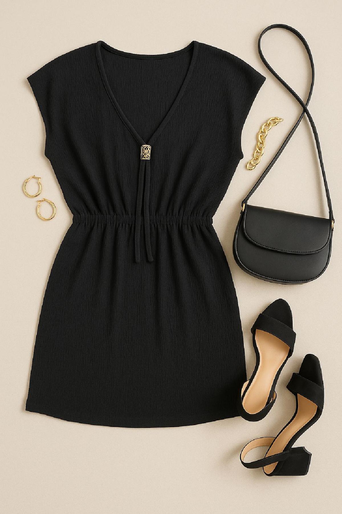 - V yaka tasarımı sayesinde zarif bir görünüm kazandıran bu mini elbise, sandalet, terlik ya da topuklu ayakkabılarla kolayca kombinlenebilir.