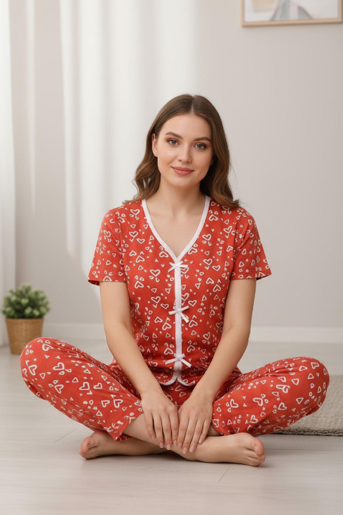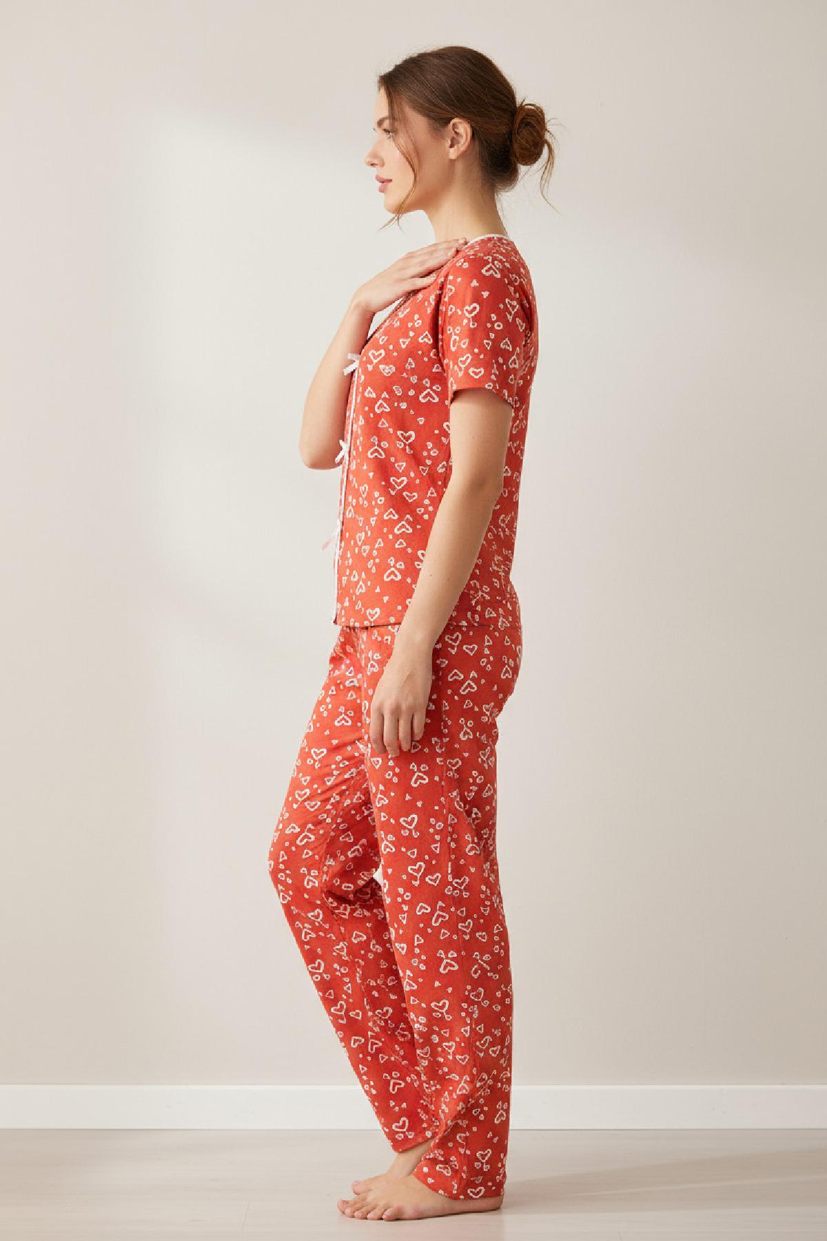 Canlı ve enerjik tarzıyla dikkat çeken Kadın Turuncu Kalp Desenli Fiyonklu Kısa Kollu Uzun Pijama Takımı, evde geçirdiğiniz her ana pozitif enerji katıyor.
