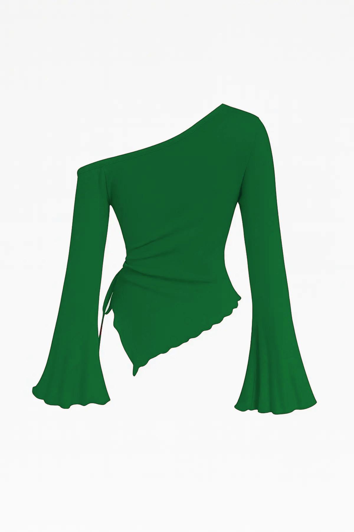 - Kadın Yeşil Asimetrik Yaka Drapeli Yan Bağlamalı Bluz, doğanın huzurunu ve modern zarafeti buluşturuyor.