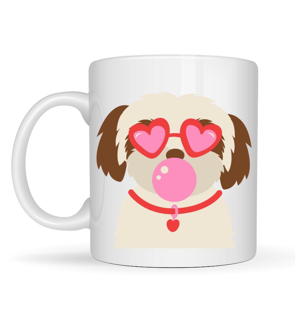 Shih Tzu cinsi; neşeli, sevgi dolu ve sadık yapısıyla bilinir. Kupadaki kalp şeklindeki gözlükler ise sevgi, mutluluk ve pozitif enerjiyi simgeler. Sakız balonu detayıyla tasarım daha da eğlenceli bir hale gelirken, kupaya bakan herkesin yüzünde tatlı bir tebessüm oluşturur.