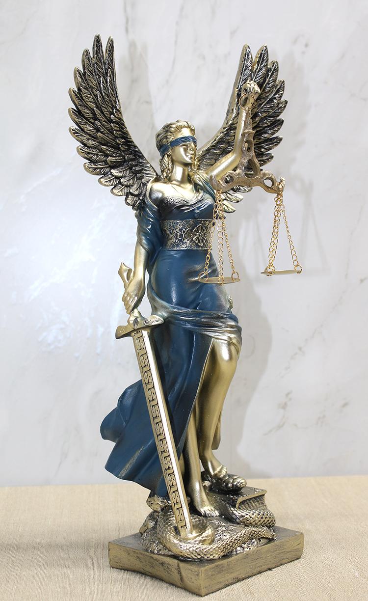 Kanatlı Adalet Biblosu Büyük Boy, adaletin simgesi olan figürü güçlü ve estetik bir duruşla yansıtan dekoratif bir heykel modelidir. 40x11 cm boyutundaki büyük ve dikkat çekici yapısı sayesinde ofislerde, çalışma masalarında, hukuk bürolarında, kütüphanelerde ve ev dekorasyonlarında etkileyici bir tamamlayıcı olarak yer alır. Dengeli terazi detayı, zırh ve kanat işçiliği ile birleşerek figüre hem zarafet hem de güç hissi kazandırır. Polyester malzemeden üretilmiş olması ürüne uzun ömür, sağlamlık ve detaylarda yüksek işçilik sağlar. Hem dekor amaçlı hem de avukatlar, hukuk öğrencileri veya adalet temalı objeleri sevenler için anlamlı bir hediye seçeneğidir.