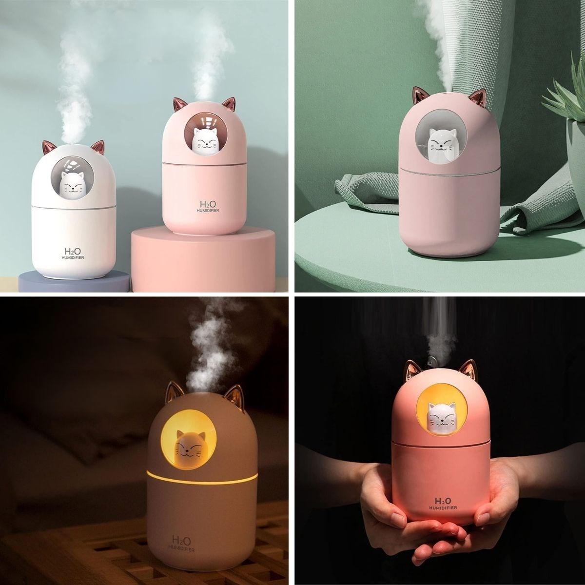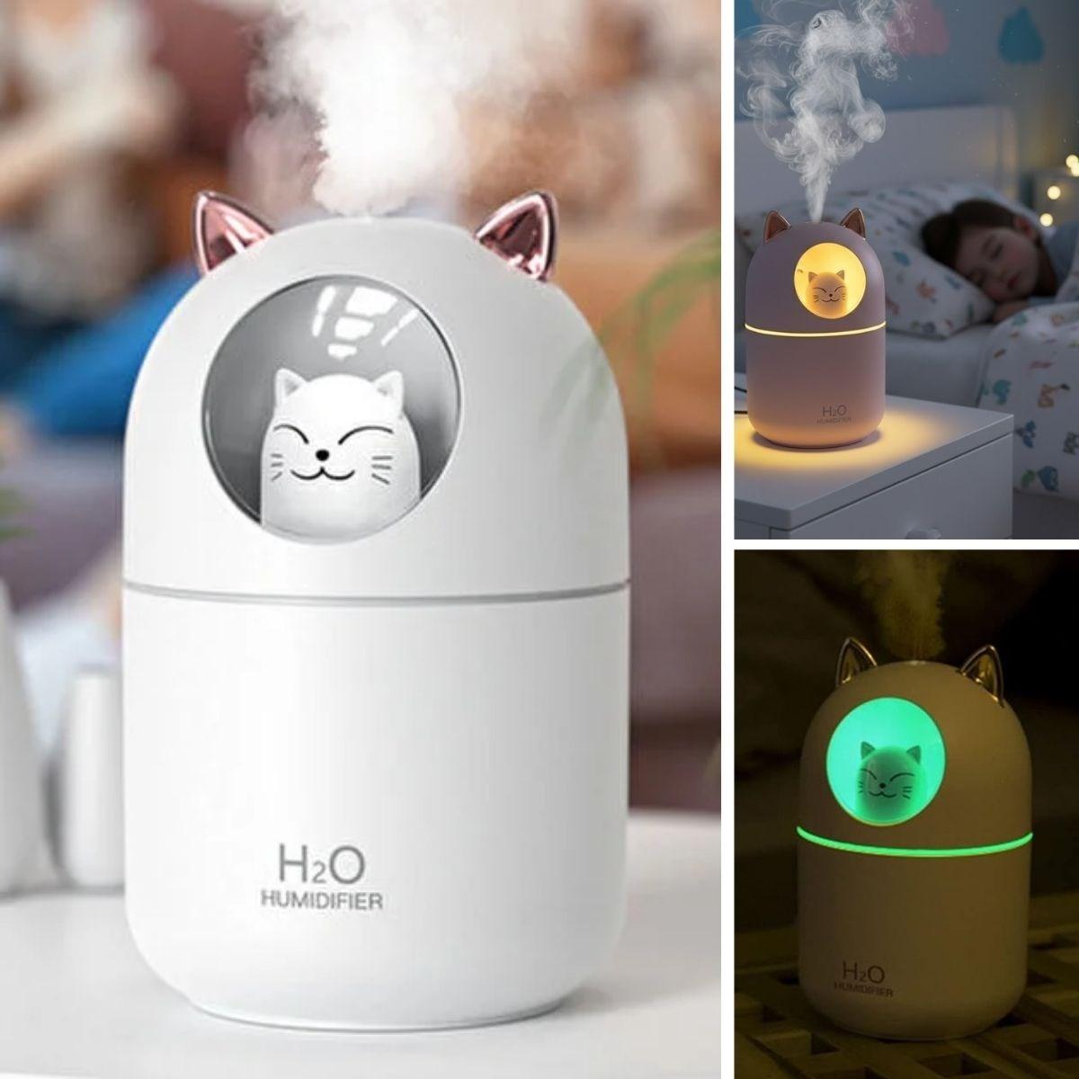 Kedicik Figürlü Hava Nemlendirici – Ultrasonik Soğuk Buhar Makinesi, LED Işıklı Masaüstü Oda Nemlendirici