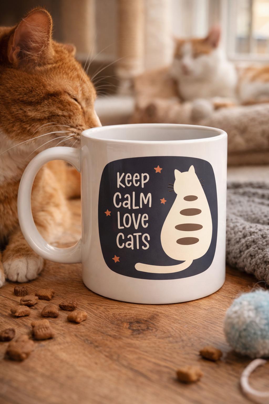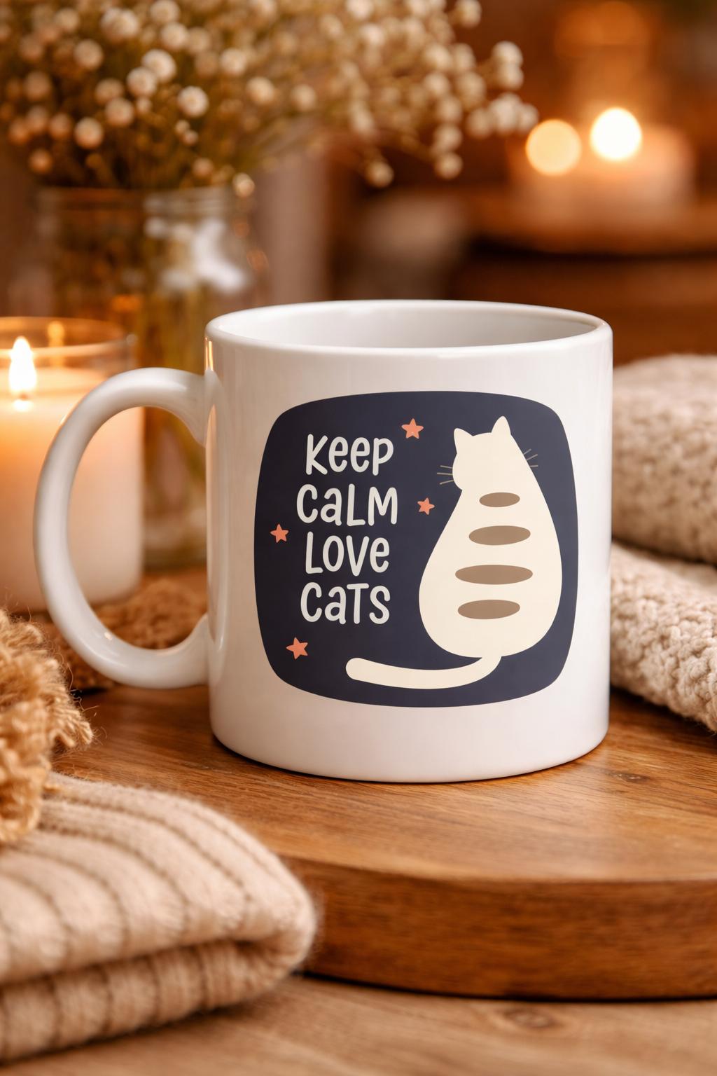 Kedilerin huzur veren dünyasını kahve keyfinize taşıyan bu özel tasarım porselen kupa, “Keep Calm Love Cats” yazısı ve sevimli kedi illüstrasyonu ile kalpleri ısıtıyor.