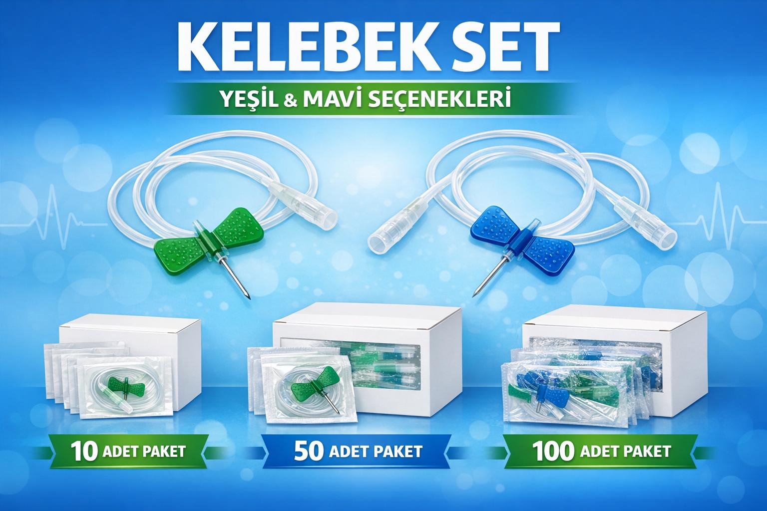 Kelebek set ürünümüz 10 adet, 50 adet ve 100 adet paket varyasyonları ile satışa sunulmuştur. Hastaneler, klinikler, sağlık merkezleri ve medikal kullanım için uygundur.