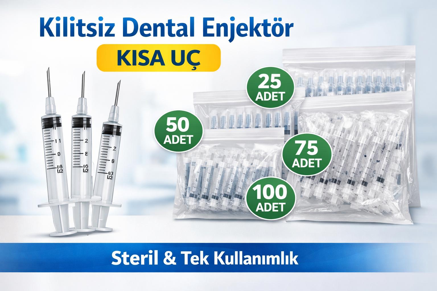 kilitsiz dental enjektör kısa uç, kısa uç dental şırınga, kilitsiz enjektör luer slip, dental enjektör kısa uç steril, diş hekimliği enjektörü kısa uç, tek kullanımlık dental enjektör, steril dental şırınga, diş kliniği sarf malzemeleri, 25 adet dental enjektör, 50 adet dental enjektör, 75 adet dental enjektör, 100 adet dental enjektör, luer slip kısa uç enjektör, medikal enjektör kısa uç