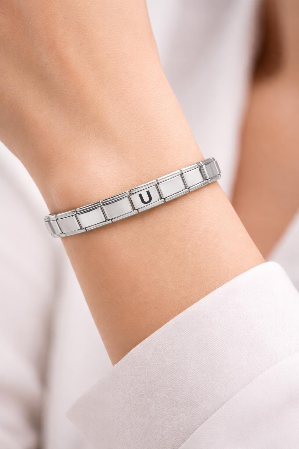 U harf detaylı çelik bileklik, zarif tasarımıyla hem günlük kombinlerde hem de özel günlerde stilini tamamlar.