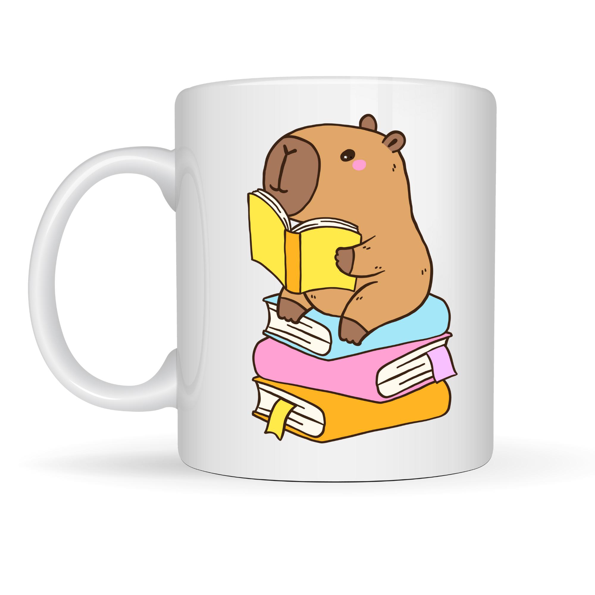 Bu özel tasarım porselen kupa, kitapların üzerinde keyifle kitap okuyan tatlı bir kapibara figürüyle tasarlandı.
