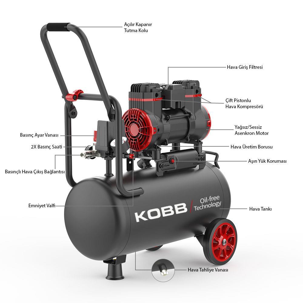 • KOBB KBK25S 1.7HP 25Lt 8Bar Yağsız Sessiz Taşınabilir Hava Kompresörü