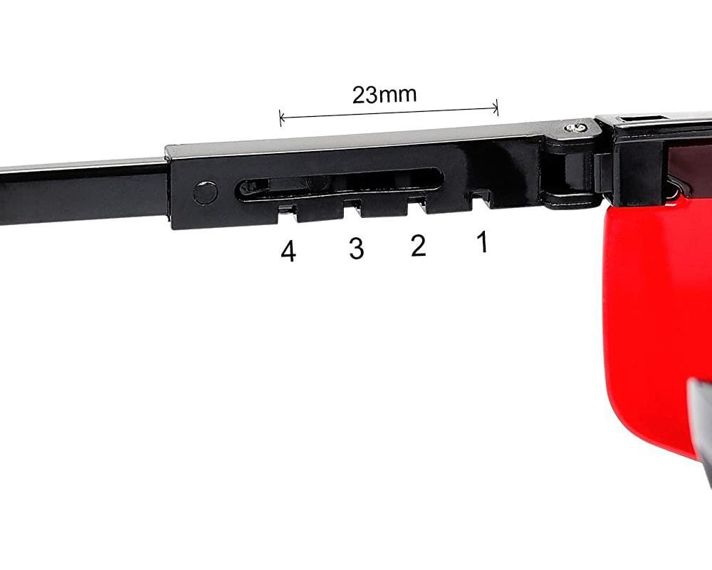 · Lazer izleme gözlüğünün uzunluğu 4 farklı uzunlukta ayarlanarak yaklaşık 2cm (9- 11,4 cm) ölçülerinde kullanılabilir. Miyop veya uzak görüşlü gözlüğünüzü çıkarmanıza gerek kalmadan kullanabilirsiniz.