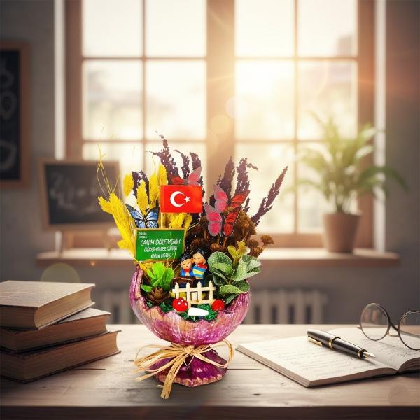 Sevginin, zarafetin ve özenin bir araya geldiği Küçük Kırık Yumurta Teraryum, Öğretmenler Günü için özel olarak tasarlanmış dekoratif bir hediyedir. 13x13x23 cm ölçülerindeki bu şık teraryum, doğal tonları ve el işçiliği detaylarıyla dikkat çeker. Her biri özenle hazırlanmış olup, içerisindeki Türk bayrağı, kelebek figürleri, minyatür öğretmen objeleri, kuru çiçekler ve yeşil yaprak süslemeler sayesinde anlamlı bir bütünlük oluşturur.Kırık yumurta formundaki saksı, hayatın kırılgan ama içindeki güzelliklerle dolu yönünü temsil eder; bu yönüyle öğretmenlerin emek dolu dünyasına zarif bir gönderme yapar. Renkli bitki süslemeleriyle donatılmış olan bu teraryum, hem modern hem klasik dekorlarla mükemmel uyum sağlar. Masa, raf veya vitrin dekoru olarak kullanılabilir.Ürün, hediye kutusu ambalajıyla sunulur ve direkt olarak hediye edilmeye hazırdır. Her bir model özel olarak tasarlandığı için model seçimi yapılamaz, görsellerde yer alan çeşitlerden karışık olarak gönderim yapılır.