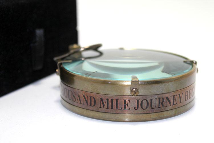 Bu şık pirinç pusula, "A THOUSAND MILE JOURNEY BEGINS WITH ONE STEP" (Bin Millik Yolculluk Bir Adımla Başlar) yazısı ile özel bir tasarıma sahiptir. Pirinç malzemeden yapılmış olan pusula, vintage tarzıyla hem dekoratif hem de fonksiyoneldir. Sağlam yapısı ve etkileyici yazısı ile hem ofis hem de ev dekorasyonunu tamamlayacak bir parçadır.