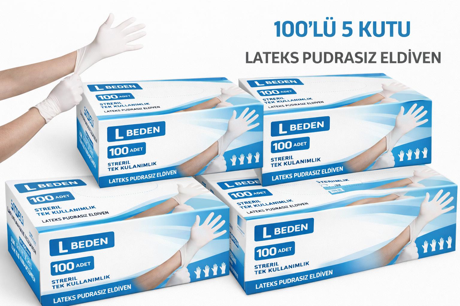 L Beden Lateks Pudrasız Eldiven 100'lü 5 Kutu (Toplam 500 Adet) Tek Kullanımlık Muayene Eldiveni