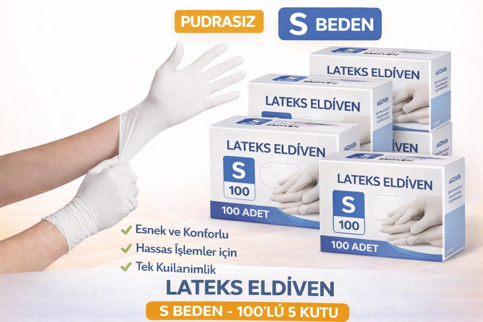 Lateks Eldiven S Beden Pudrasız 100’lü 5 Kutu Tek Kullanımlık Esnek Muayene Eldiveni Toplu Paket