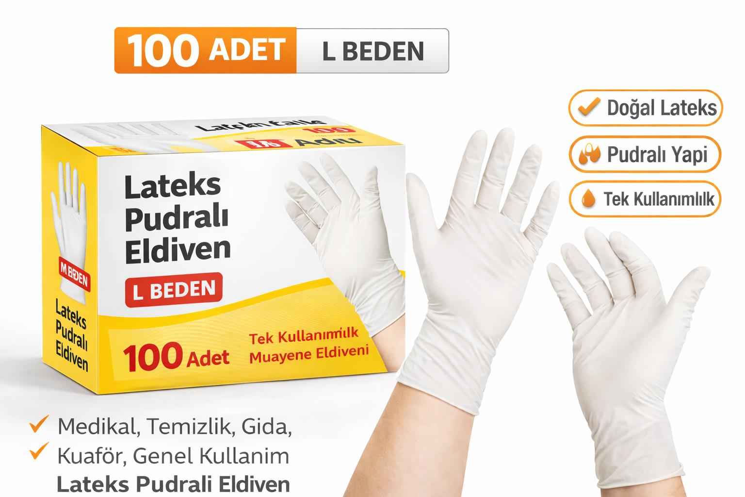 lateks pudralı eldiven, lateks eldiven l beden, pudralı eldiven 100lü, muayene eldiveni lateks, tek kullanımlık eldiven, medikal eldiven l beden, koruyucu eldiven lateks, hijyen eldiveni, lateks eldiven 100 adet, pudralı muayene eldiveni, temizlik eldiveni tek kullanımlık, gıda uyumlu lateks eldiven, büyük beden eldiven, lateks eldiven kutu, ekonomik eldiven