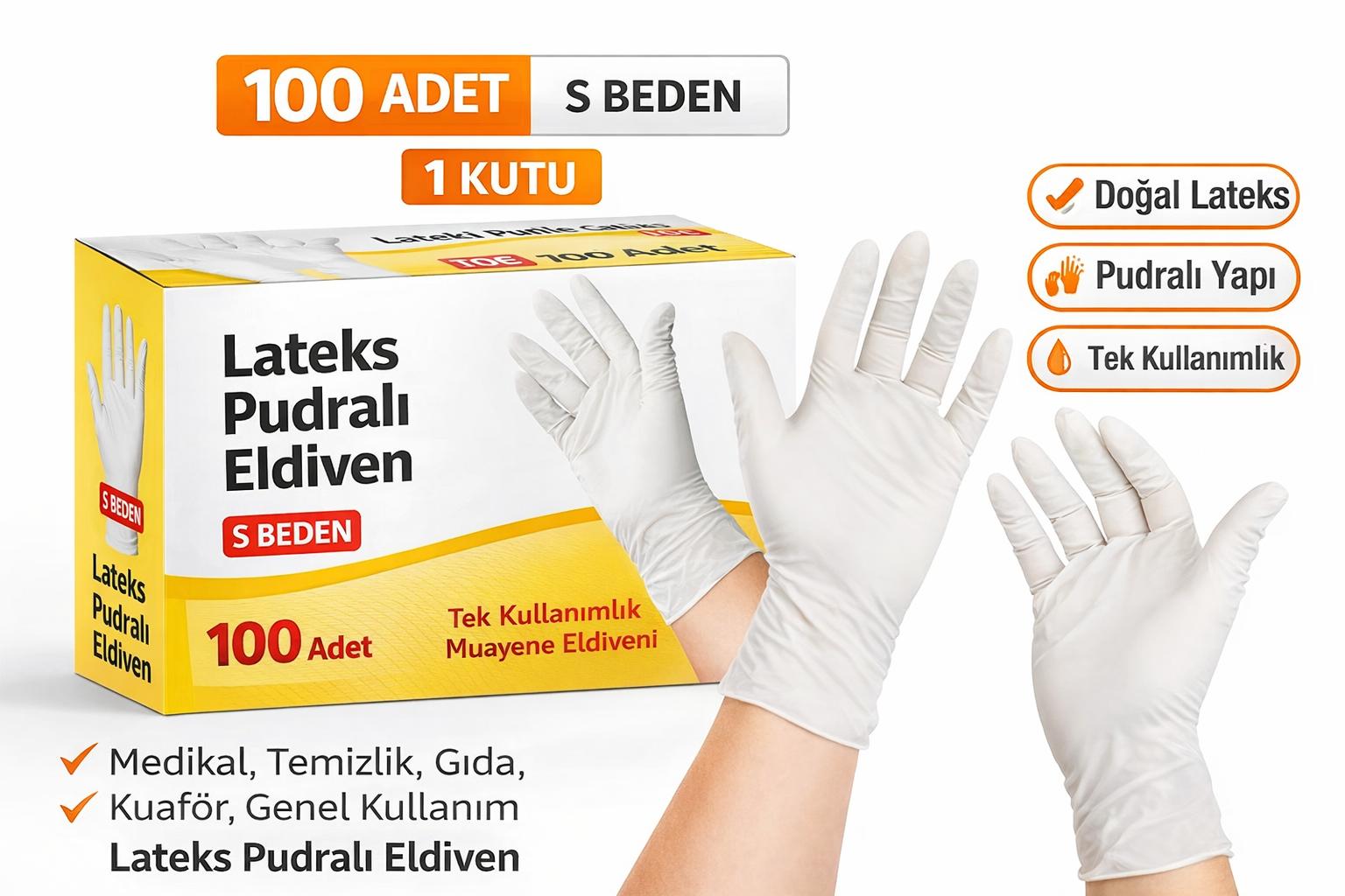 lateks pudralı eldiven, pudralı eldiven s beden, lateks muayene eldiveni, tek kullanımlık eldiven, s beden eldiven 100lü, lateks eldiven 100 adet, medikal eldiven lateks, koruyucu eldiven lateks, hijyen eldiveni, muayene eldiveni s beden, küçük beden eldiven, lateks eldiven kutu, pudralı muayene eldiveni, temizlik eldiveni tek kullanımlık, gıda uyumlu lateks eldiven