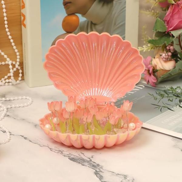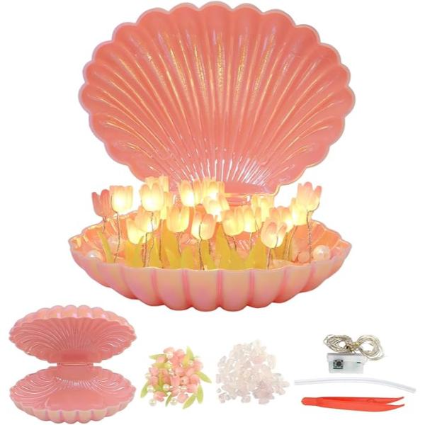Estetik tasarımıyla dikkat çeken LED ışıklı deniz kabuğu lamba, içindeki lale figürleriyle birlikte şık bir dekoratif ürün haline gelir. Kendin yap (DIY) set olarak sunulan ürün, içerisinde LED ışık, yapay laleler, dekoratif taşlar ve montaj aparatı ile birlikte gelir. Açılabilir pembe deniz kabuğu tasarımı sayesinde hem gece lambası hem de süs objesi olarak kullanıma uygundur. Yumuşak LED ışığı ortama sıcaklık katarken, ev dekorasyonuna romantik bir hava verir. Özellikle hediye olarak da tercih edilebilecek bu ürün, kullanıcıya kendi tasarımını oluşturma keyfi sunar.