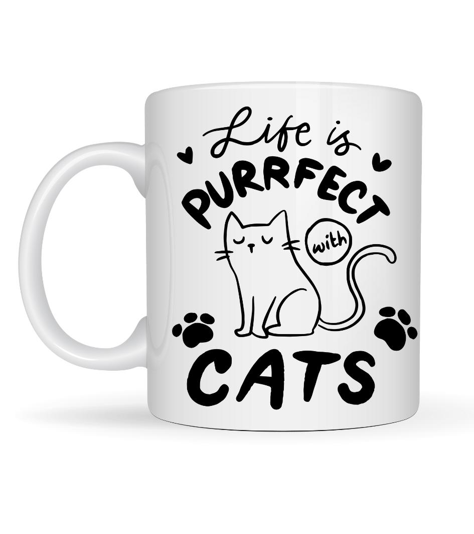 Üzerinde yer alan “Life is Purrfect with Cats” yazısı, kedilerin hayatımıza kattığı huzuru, sevgiyi ve mutluluğu anlatıyor. Sevimli kedi çizimi ve pati detaylarıyla tasarlanan bu kupa, hem eğlenceli hem de sıcacık bir his uyandırıyor.