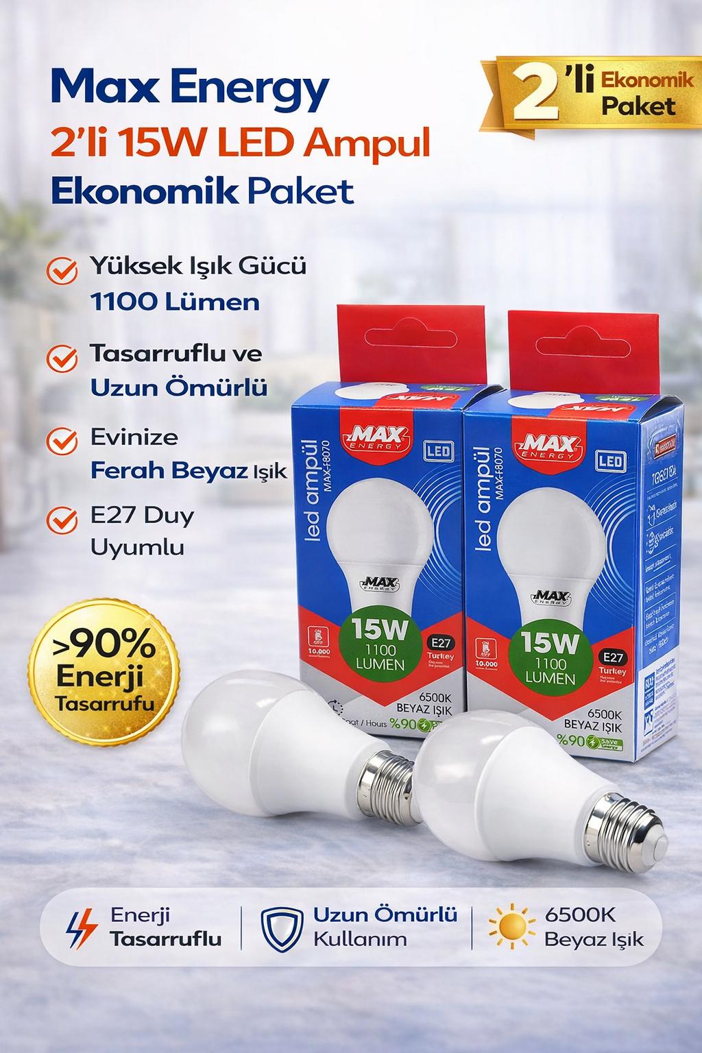 Max Energy 15W LED Ampul E27 Duy 6500K Beyaz Işık 1100 Lümen Tasarruflu Ampul 2 Adet