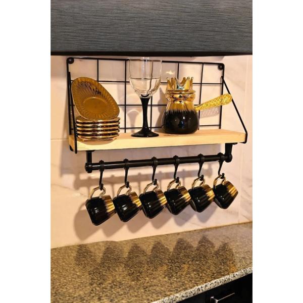 Metal askılıklı kahve köşesi rafı, mutfağınızda düzeni ve şıklığı bir arada sunar. Üst kısmı ahşap raf, alt kısmı ise metal boru üzerine yerleştirilmiş 6 adet sağlam askılıktan oluşur. Duvara monte edilebilen bu dekoratif düzenleyici, kahve fincanlarınızı, küçük tabakları, kavanozları ve mutfak aksesuarlarını estetik bir biçimde sergilemenize olanak tanır. Mutfak tezgâh üstü alanlarda veya kahve köşelerinde fonksiyonel ve modern bir görünüm yaratır. Metal iskeleti sayesinde uzun ömürlü kullanım sağlar. Az yer kaplayan tasarımı ile dar alanlarda bile pratik çözümler sunar.Ürün ölçüleri; uzunluk 42 cm, genişlik 13 cm, yükseklik 20 cm'dir.