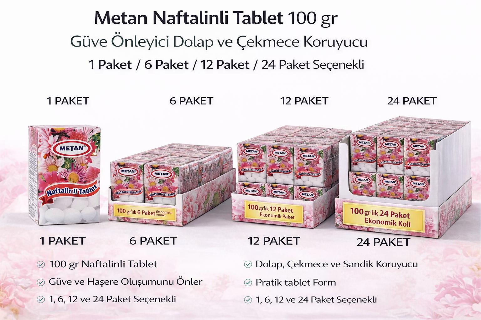 metan naftalinli tablet, naftalin tablet 100 gr, güve kovucu tablet, dolap naftalini, çekmece naftalini, sandık naftalini, güve önleyici ürün, dolap koruyucu naftalin, 6 lı naftalin, 12 li naftalin, 24 lü naftalin, toptan naftalin tablet, ekonomik naftalin paketi, elbise dolap koruyucu