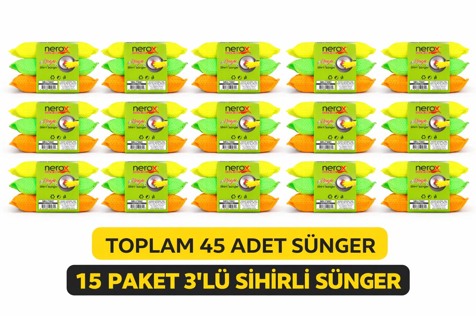 Nerox Magic Sihirli Sünger 3’lü 15 paket toplam 45 adet temizlik süngeri içeren ekonomik ve uzun süreli kullanım sağlayan çok amaçlı temizlik ürünüdür. Özel dokulu yapısı sayesinde mutfak, banyo ve bulaşık temizliğinde etkili temizlik sağlar.