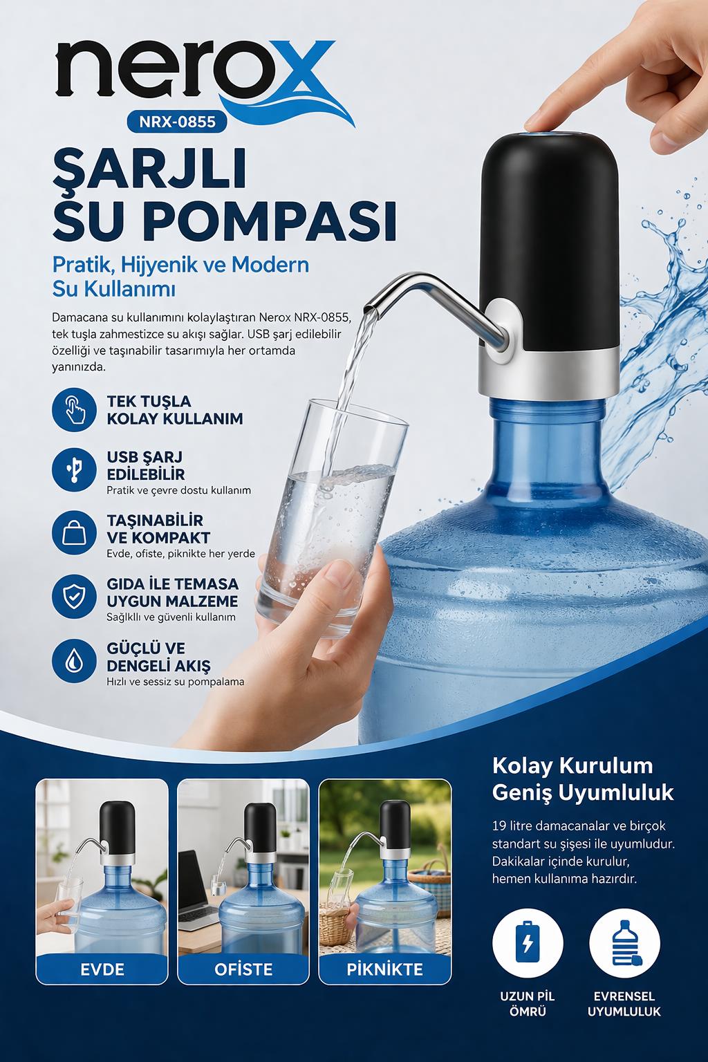 şarjlı su pompası, damacana su pompası, nerox su pompası, usb su pompası, otomatik su pompası, damacana aparatı, elektrikli su pompası, su sebili pompası, taşınabilir su pompası, nrx0855, damacana su makinesi, su pompası fiyatları, pratik su pompası, ev tipi su pompası, şarjlı damacana pompası