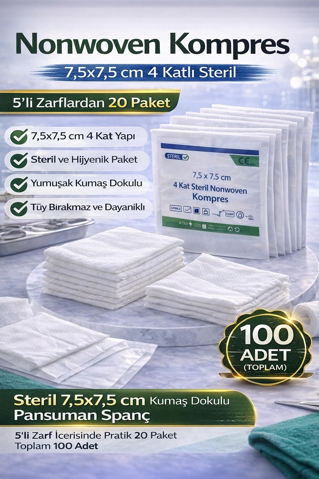 nonwoven kompres, steril spanç, 7,5x7,5 kompres, 4 katlı spanç, 5’li steril spanç, medikal kompres, pansuman pedi, steril gazlı bez, kumaş dokulu spanç, yara temizleme pedi, hastane spanç, 100 adet kompres, steril nonwoven spanç