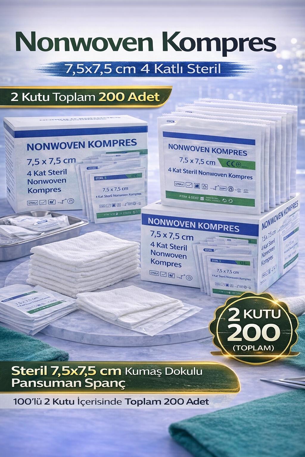 nonwoven kompres, steril spanç, 7,5x7,5 kompres, 4 katlı spanç, medikal kompres, pansuman pedi, steril gazlı bez, kumaş dokulu spanç, yara temizleme pedi, hastane spanç, steril nonwoven spanç, 200 adet kompres, 2 kutu kompres