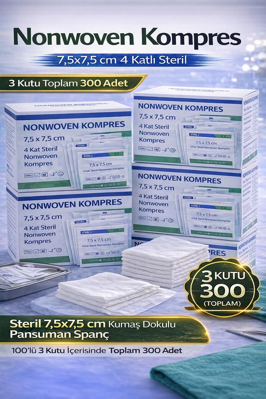nonwoven kompres, steril spanç, 7,5x7,5 kompres, 4 katlı spanç, medikal kompres, pansuman pedi, steril gazlı bez, kumaş dokulu spanç, yara temizleme pedi, hastane spanç, steril nonwoven spanç, 300 adet kompres, 3 kutu kompres