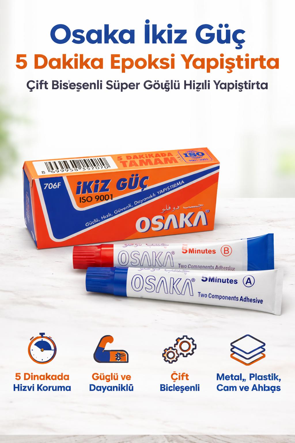 Osaka İkiz Güç 5 Dakika Epoksi Yapıştırıcı, yüksek performanslı çift bileşenli formülü ile güçlü ve kalıcı yapıştırma sağlar. Hızlı kuruma özelliği sayesinde yalnızca 5 dakika içerisinde etkili sonuç verir ve zamandan tasarruf etmenizi sağlar.