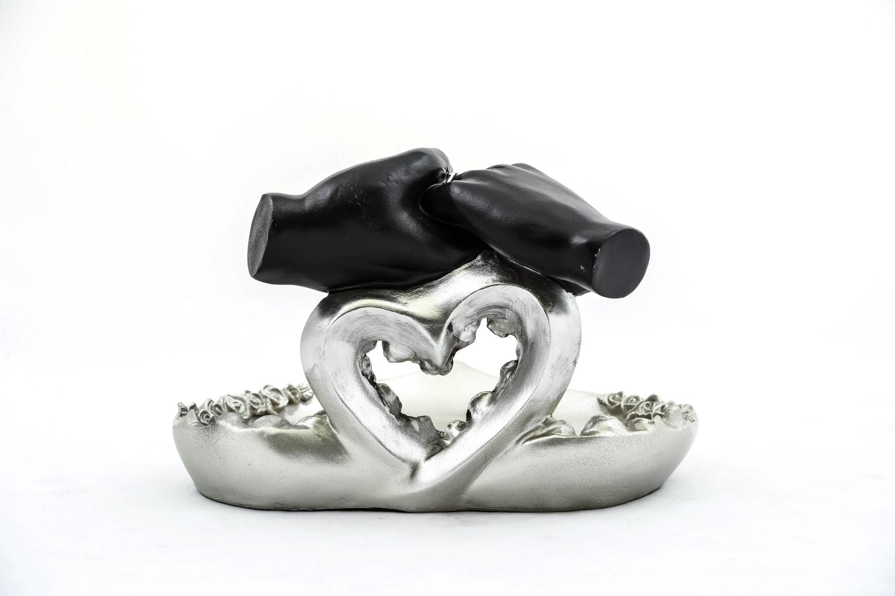 Modern bir tasarıma sahip olan bu özel tasarım kalpli sunum tepsisi, şık ve estetik detaylarla tamamlanmıştır. 23x16 cm boyutunda, siyah ellerin ve gümüş renkli gül motiflerinin birleşimiyle tasarlanmış olan bu obje, hem görsel açıdan etkileyici hem de dekoratif açıdan dikkat çekicidir. Polyester malzemeden üretilen bu sunum tepsisi, zarif yapısı ile sofralarınızı ve iç mekan dekorasyonunuzu zenginleştirir. Hem şık bir hediye hem de eşsiz bir koleksiyon parçası olarak kullanılabilir.