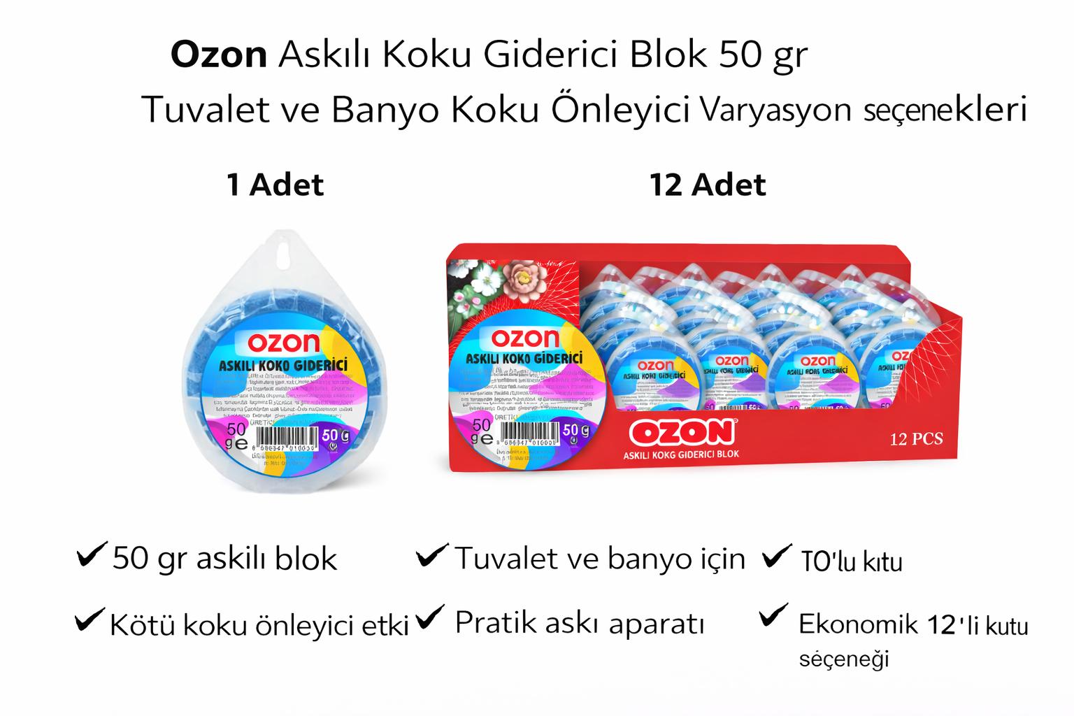 Ozon Askılı Koku Giderici Blok 50 gr, tuvalet ve banyolarda oluşan kötü kokuları önlemeye yardımcı olur ve ortamda ferah bir etki sağlar. Askılı tasarımı sayesinde klozet içine kolayca asılarak pratik kullanım sunar.