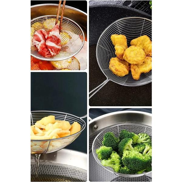 Paslanmaz çelikten üretilmiş olan bu kevgir, dayanıklı yapısı ve pratik kullanımıyla mutfakta vazgeçilmez bir yardımcıdır. 16 cm uzunluğundaki kompakt yapısıyla özellikle küçük tencerelerde ve az miktarda gıda ile yapılan kızartmalarda büyük kolaylık sağlar. Tel yapısı sayesinde kızartma yağı gibi sıvıların hızla süzülmesine olanak tanır. Ergonomik sapı el yakmaz ve güvenli bir tutuş sağlar. Paslanmaz çelik yüzeyi sayesinde hijyeniktir ve uzun ömürlü kullanım sunar. Bulaşık makinesinde yıkanabilir. Ev mutfaklarında olduğu kadar profesyonel mutfaklarda da tercih edilen bir üründür.