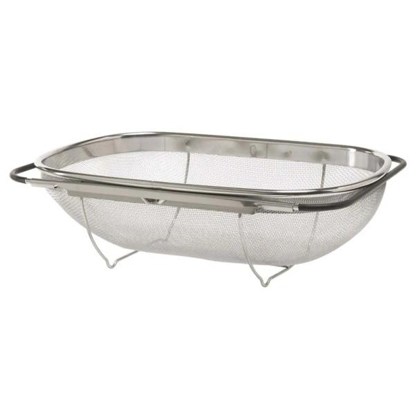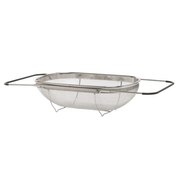 Paslanmaz çelik teleskopik süzgeç, meyve, sebze, makarna gibi yiyecekleri yıkamak veya süzmek için kullanılır. Dayanıklı paslanmaz çelik yapısı uzun ömürlüdür ve etkili süzme sağlar. İnce delikli tel örgü yapısı sayesinde küçük parçaların kaçmasını önler. Teleskopik açılıp kapanabilir yan kolları, süzgecin lavabo üzerine kolayca yerleştirilmesini sağlar ve farklı lavabo genişliklerine uyum gösterir. Süzgeç, katlanabilir ayakları sayesinde yerden yükseltilerek daha hijyenik kullanım sunar. Hem ev tipi mutfaklar hem de profesyonel mutfaklar için uygundur.