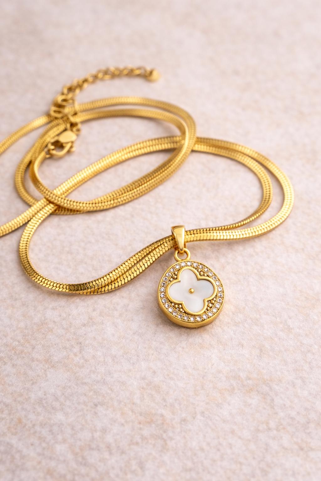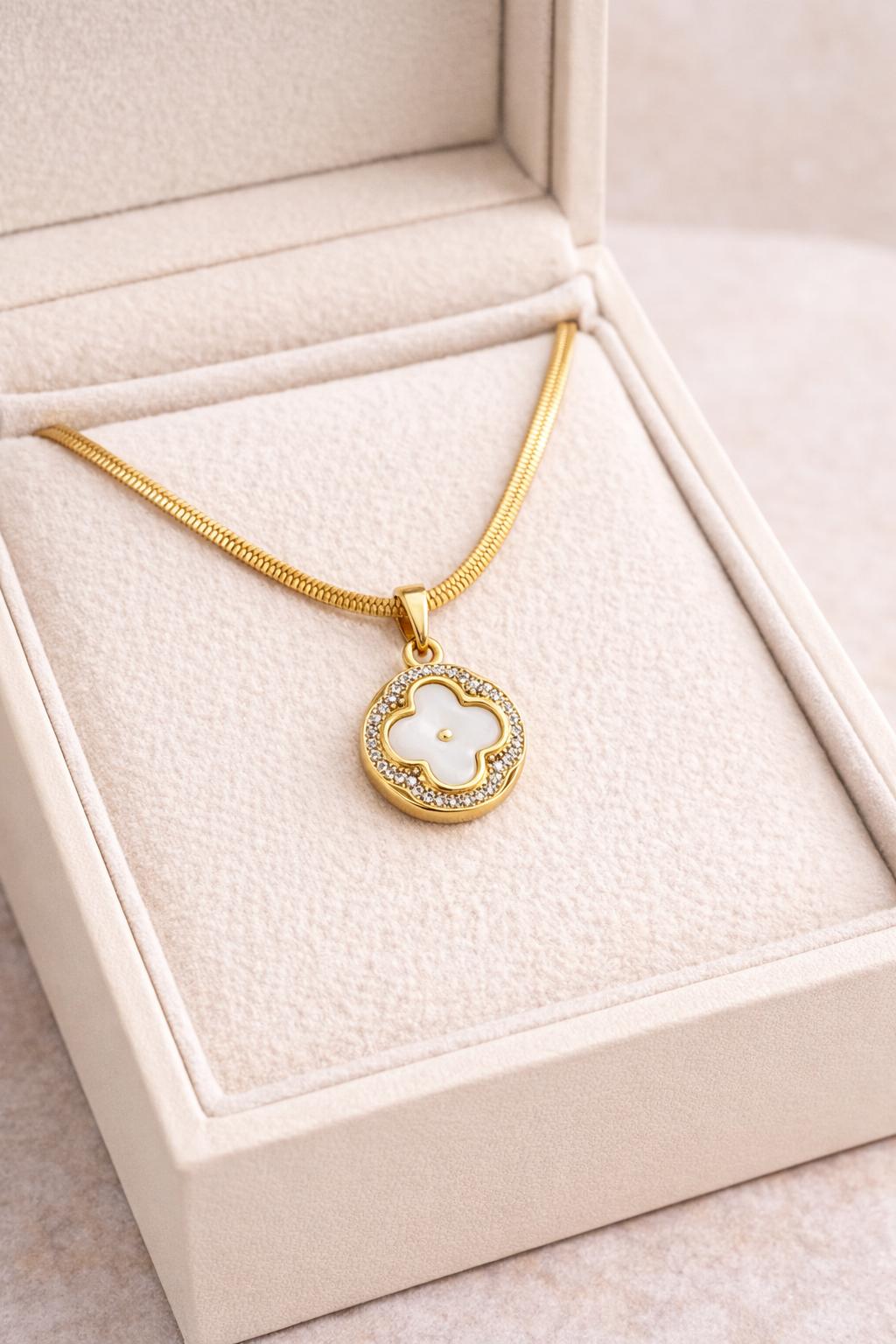 Paslanmaz Çelik Yonca Kolye MODEL 8 – Gold Kaplama Sedef Görünümlü Zirkon Taşlı | Kararmaz Kadın Kolyesi