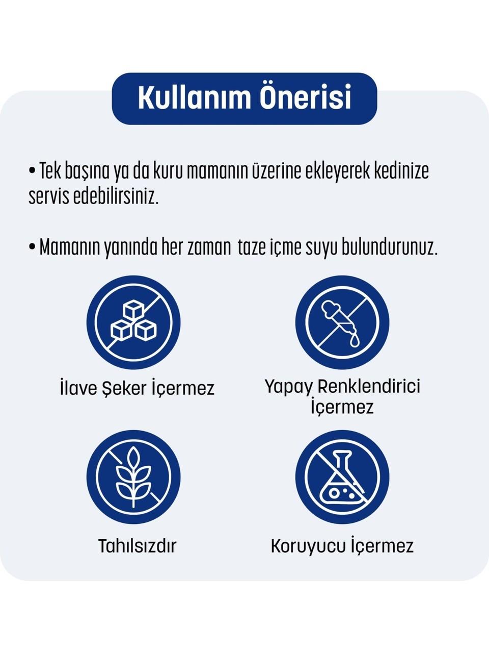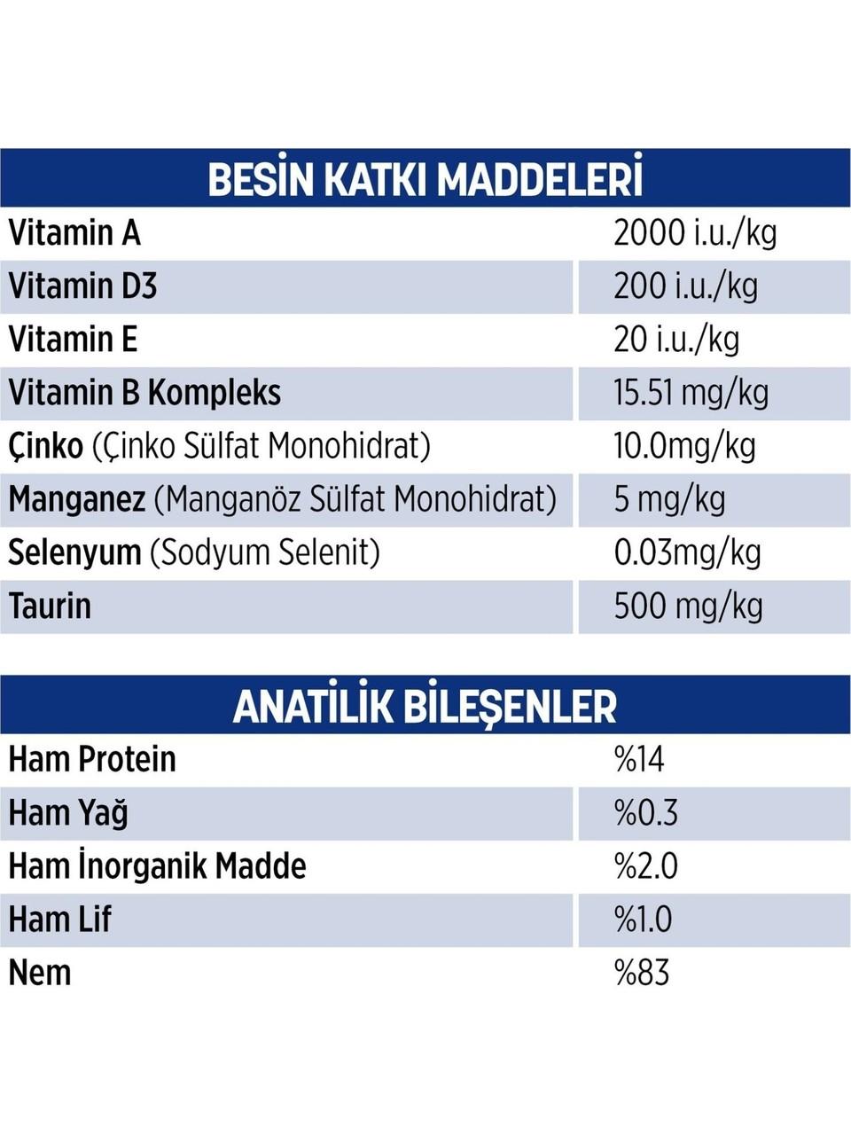 Yüksek protein oranı kas yapısını desteklerken, deniz ürünlerinden gelen doğal besin değerleri genel sağlığı desteklemeye yardımcı olur. Yüksek nem içeriği sayesinde kedinizin sıvı alımına katkı sağlar. Günlük ana öğün olarak veya kuru mamaya lezzet artırıcı tamamlayıcı şeklinde güvenle kullanılabilir.