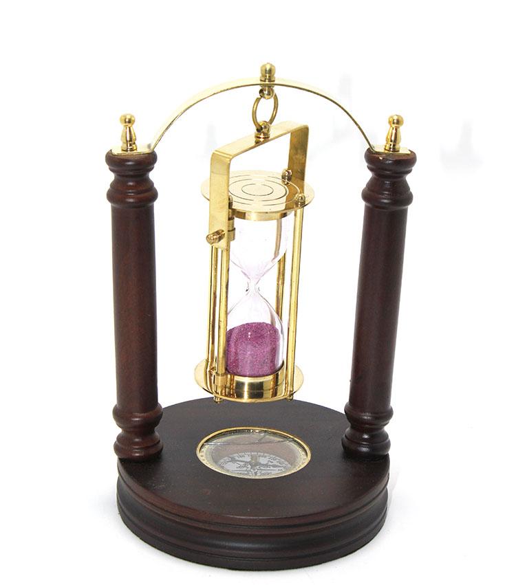 Alt kısmı ve yanları ahşap olup kalan kısmı pirinç malzemeden üretilmiştir. Klasik ve şık tasarımıyla dekoratif bir aksesuar olarak kullanılabilir. Kum saati mekanizması, zamanı şık bir şekilde takip etmek isteyenler için ideal bir seçenektir. Alt kısmında yer alan pusula detayı, vintage bir hava katarken pratik bir fonksiyon sunar. Hem koleksiyonluk bir obje hem de kullanışlı bir masa aksesuarı olarak tercih edilebilir.Paket İçeriği