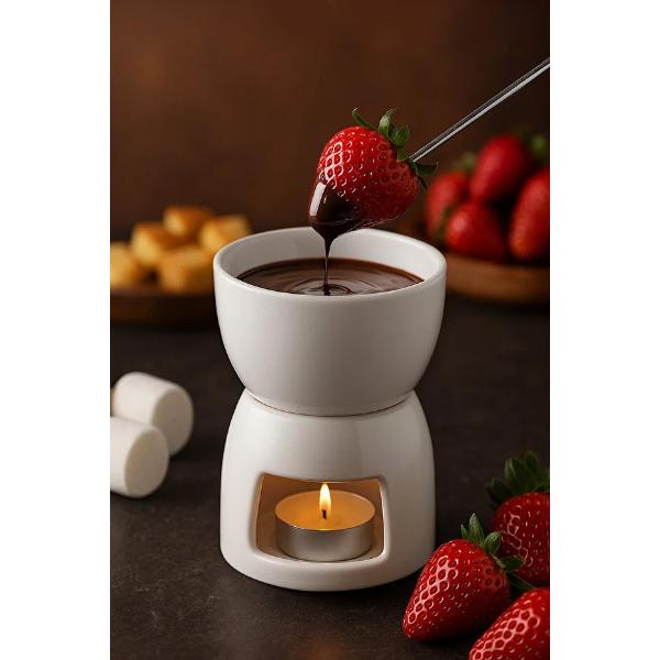 Evde romantik anlar, keyifli akşamlar ve tatlı sunumlar için mükemmel bir tercih olan Porselen Fondü Seti, şık ve minimalist tasarımıyla dikkat çeker. Isıya dayanıklı porselen malzemeden üretilmiş bu set, çikolata, peynir veya karamel gibi lezzetleri eritirken mükemmel ısı dengesini korur.Alt kısmında yer alan mum haznesi, içerideki çikolata veya peyniri ideal sıcaklıkta tutar; böylece fondü keyfi uzun süre devam eder. Renkli saplara sahip iki adet metal çatal, hem pratik hem de estetik bir kullanım sunar. Bu sayede meyvelerinizi, marshmallow’larınızı veya atıştırmalıklarınızı hijyenik ve rahat bir şekilde fondüye batırabilirsiniz.Küçük boyutu sayesinde masa üzerinde fazla yer kaplamaz ve kolayca taşınabilir. Şık görünümüyle davet sofralarınıza zarif bir dokunuş katar, aynı zamanda özel günlerde sevdiklerinize hediye olarak da mükemmel bir seçimdir.Hem pratik hem de dekoratif yapısıyla mutfağınızın en zarif yardımcılarından biri olacak bu fondü seti, tatlı sunumlarına profesyonel bir dokunuş kazandırır.