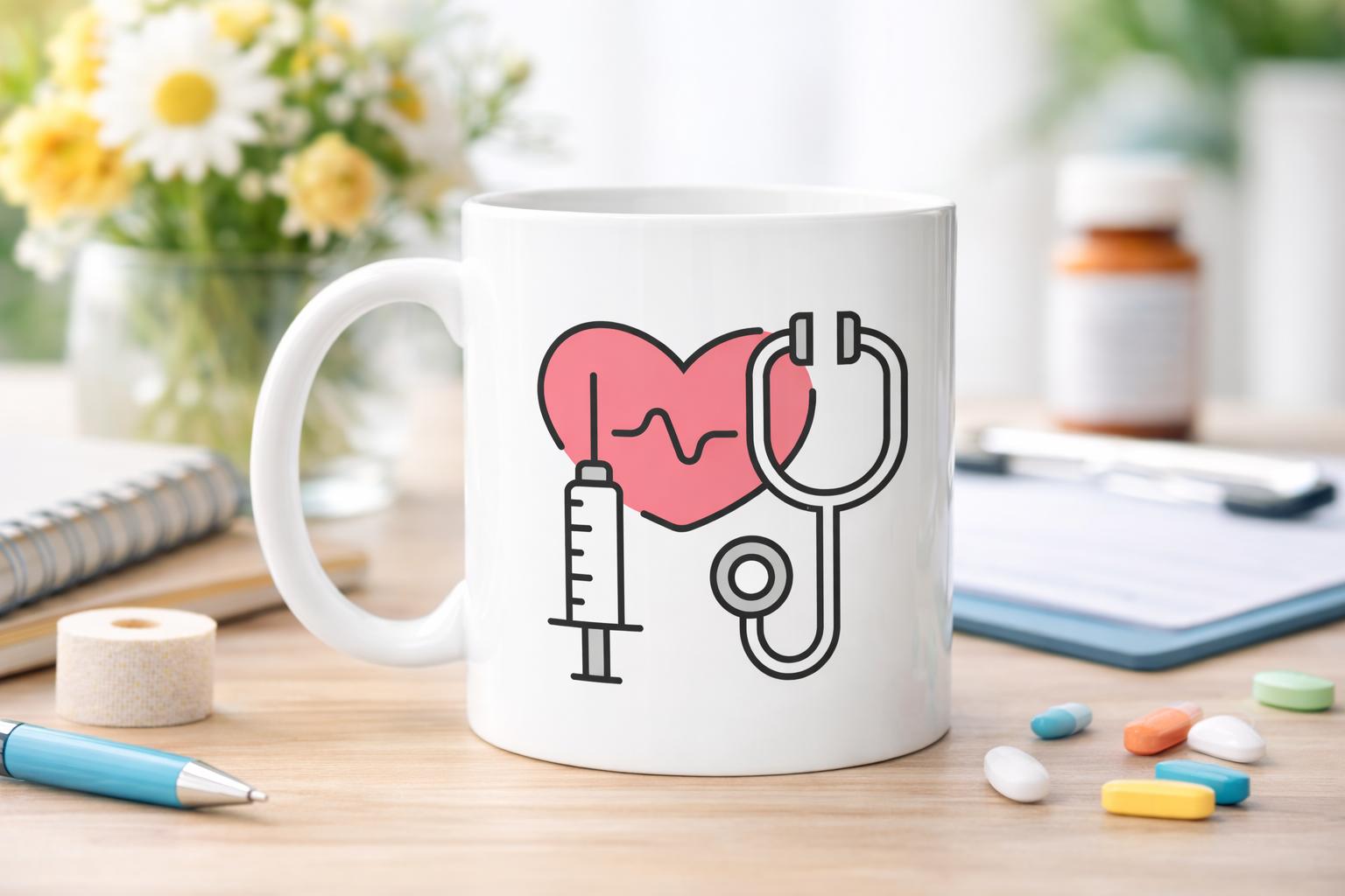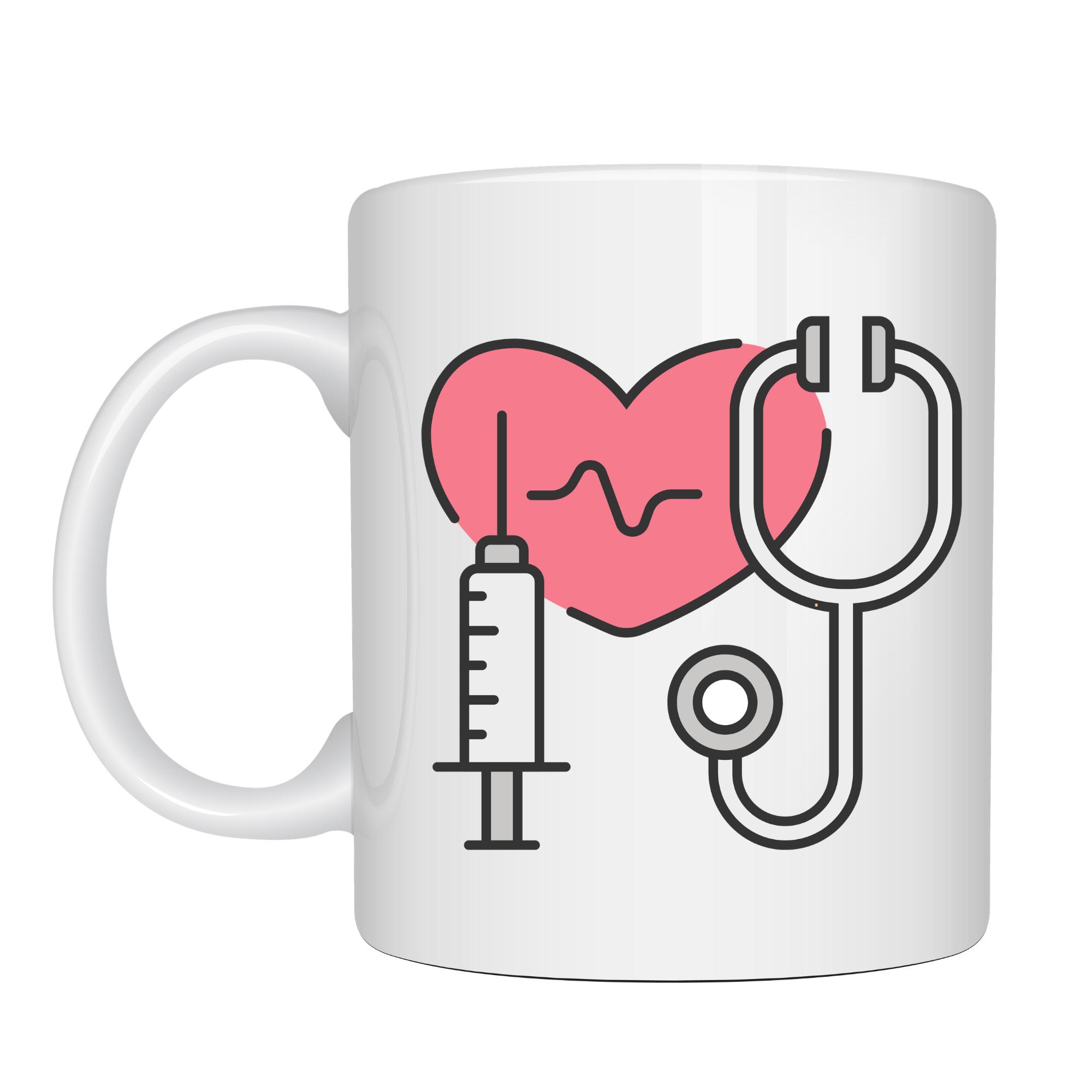 Sağlık Temalı Porselen Kupa MODEL 170 – Stetoskop Kalp ve Şırınga Tasarımlı Kahve Kupası – Doktor ve Hemşire Hediyesi