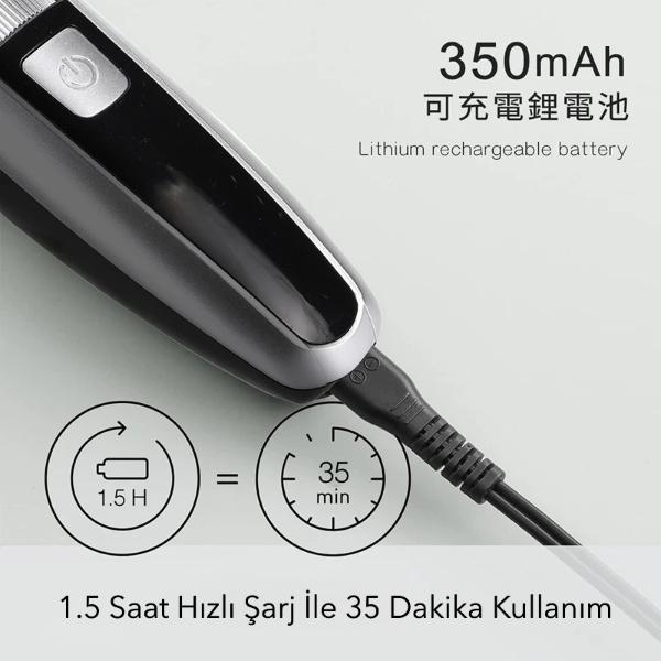 Güçlü 350mAh lityum batarya sayesinde 1,5 saatte tam şarj olur ve 4 saate kadar kesintisiz kullanım sağlar. USB girişi ile evde, ofiste veya seyahatte kolayca şarj edilebilir.