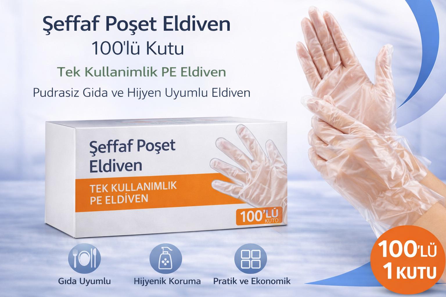 Şeffaf Poşet Eldiven 100’lü Kutu Tek Kullanımlık PE Eldiven Pudrasız Gıda ve Hijyen Uyumlu Eldiven