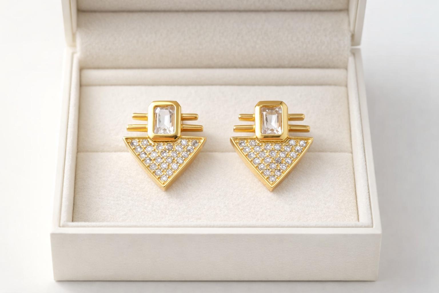 Serenay Küpe MODEL 7 – Geometrik Zirkon Taşlı Gold Renk Çelik Küpe, Kararma Yapmaz & Alerji Dostu