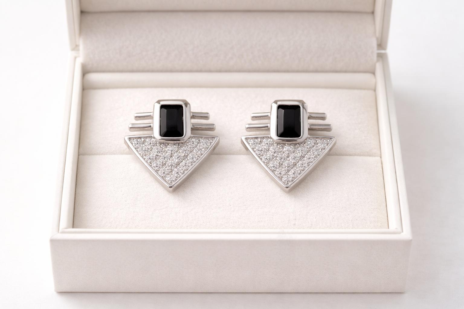 Modern çizgileri ve güçlü duruşuyla öne çıkan Serenay Küpe, siyah taş detayı ve geometrik tasarımıyla stiline net bir karakter kazandırır.
