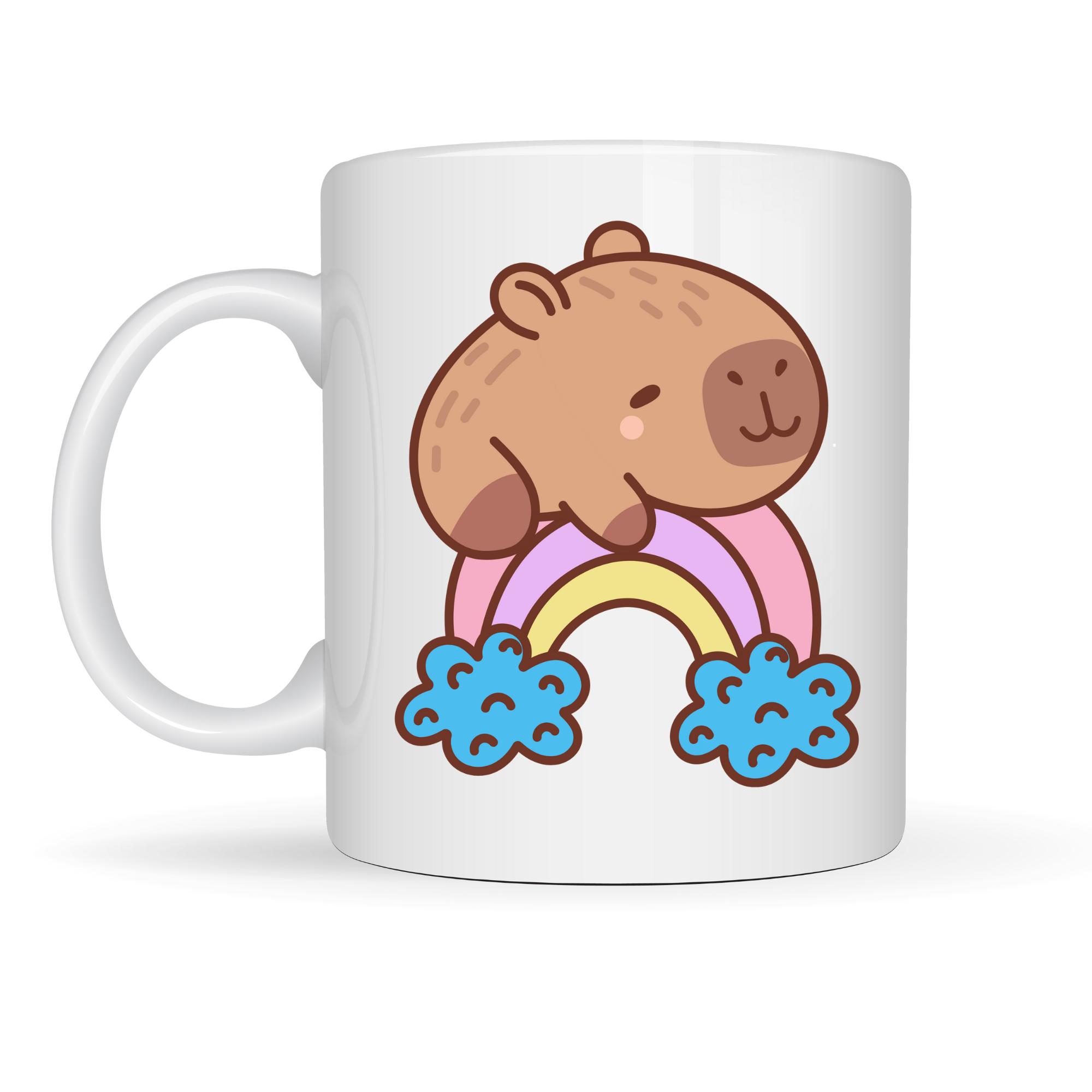 Bu özel tasarım porselen kupanın üzerinde, gökkuşağının üzerinde huzurla oturan sevimli bir kapibara yer alıyor. Yumuşak renkleri, tatlı ifadesi ve pastel tonlarıyla bakar bakmaz iç ısıtan bir tasarım sunuyor ??