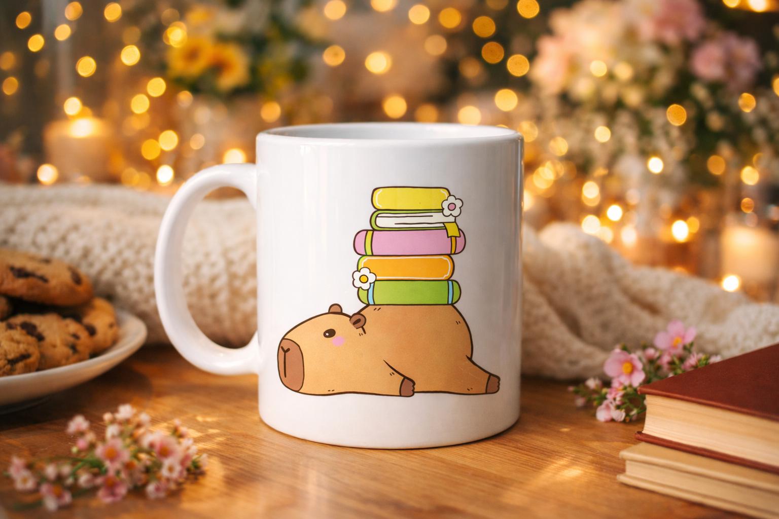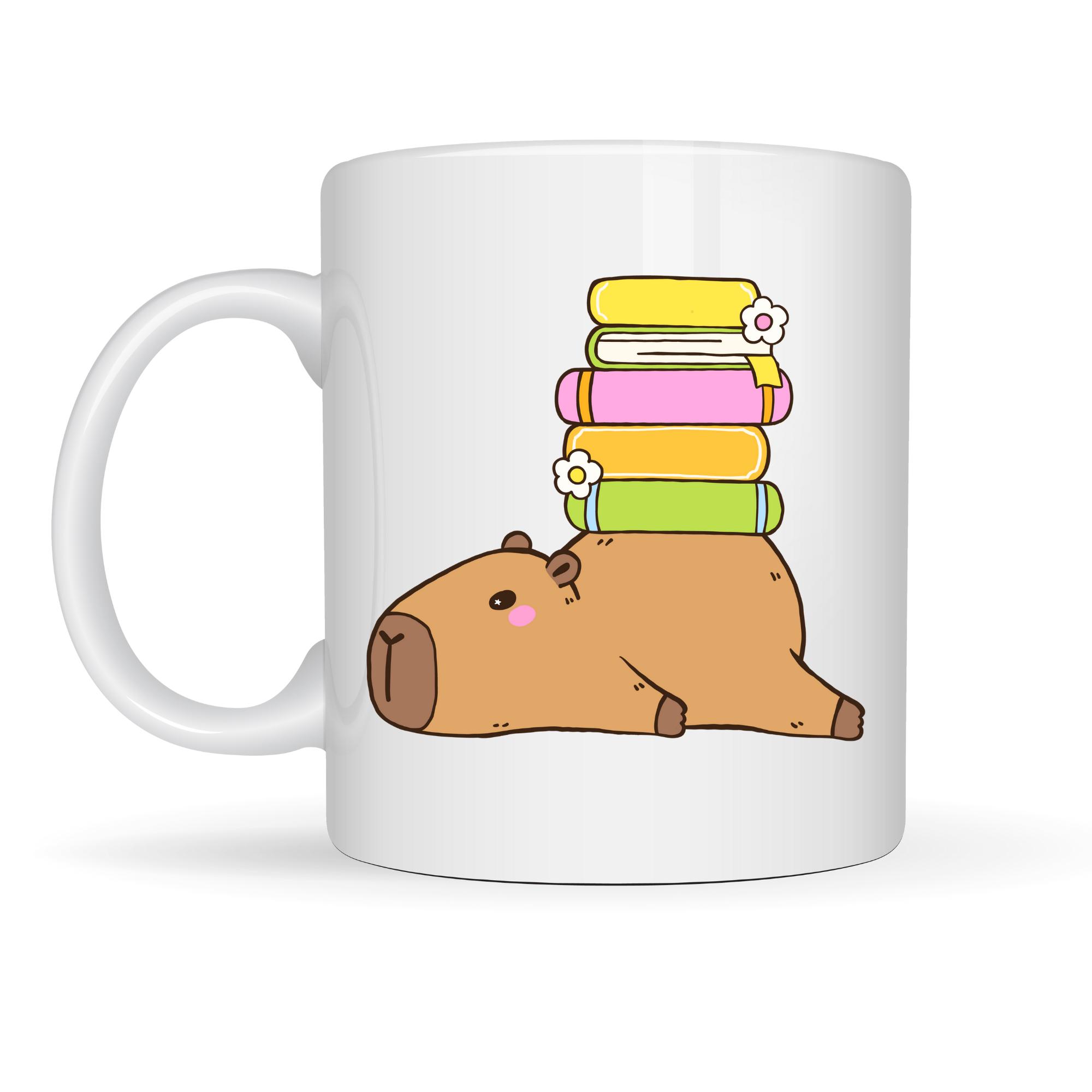 Sevimli Kapibara Kitaplı Kupa MODEL 101 – Kahve & Çay Kupası Kitap Severlere Özel Tatlı Tasarım Porselen Kupa