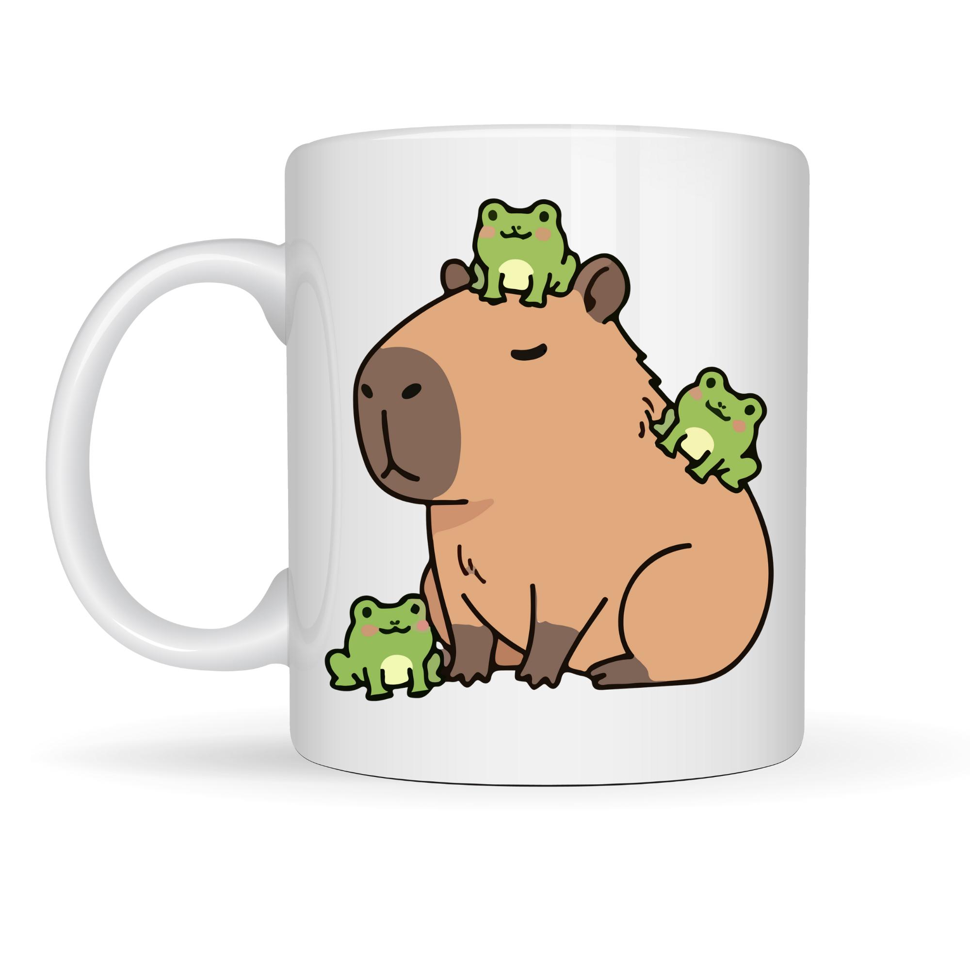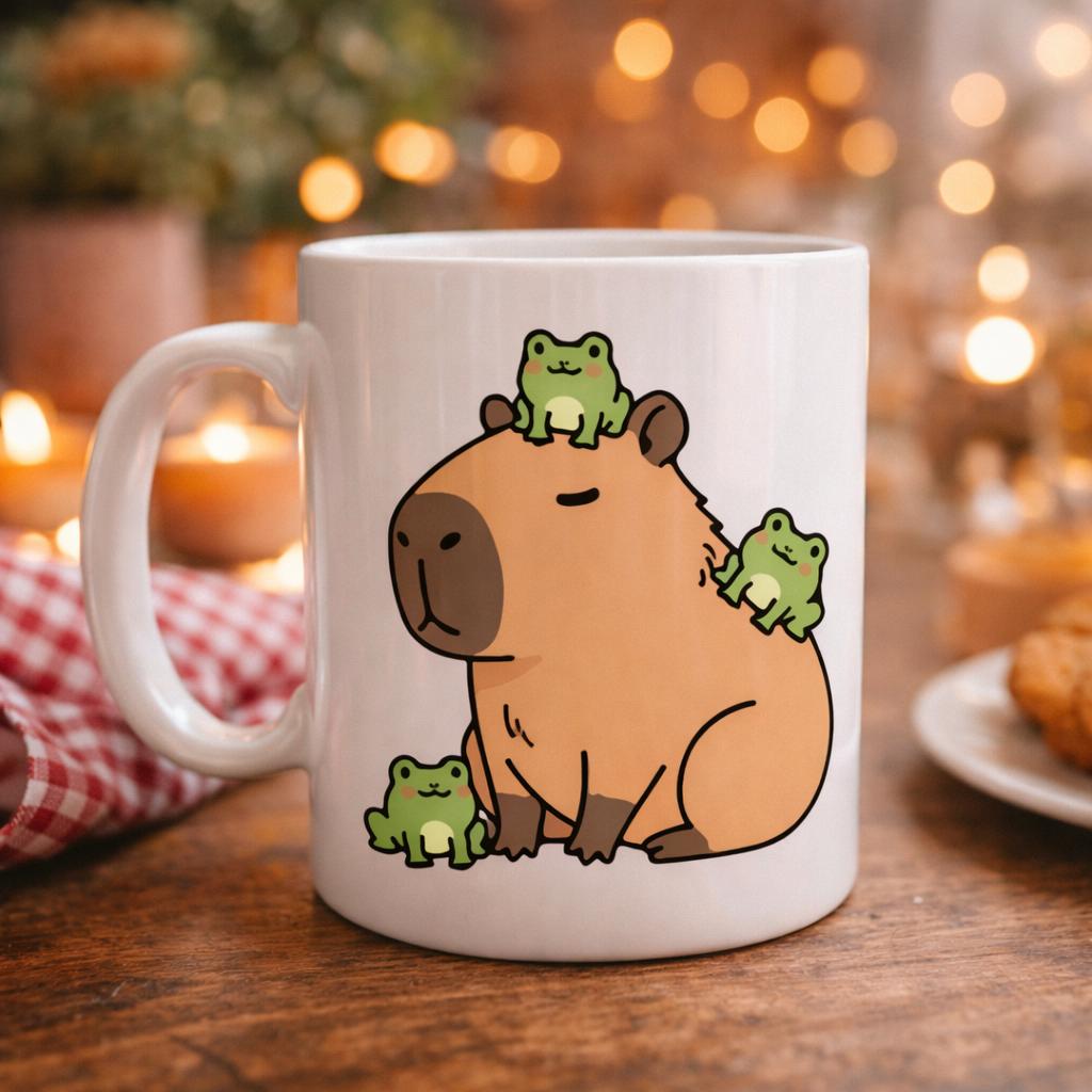 Bu sevimli porselen kupa, üzerinde yer alan tatlı kapibara ve minik kurbağa figürleriyle içini ısıtan, gülümseten bir tasarıma sahip.
