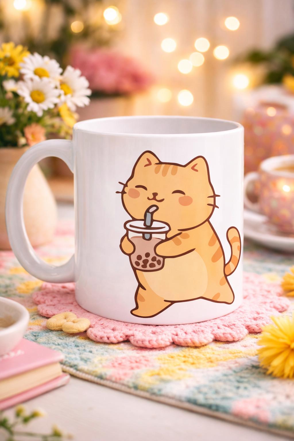 Bu sevimli porselen kupanın üzerinde yer alan tatlı kedi figürü, elinde bubble tea içeceğiyle mutlu ve keyifli bir anı temsil ediyor. Neşeli ifadesi ve sıcak tasarımı, günlük hayatın küçük mutluluklarını hatırlatan samimi bir atmosfer oluşturur.