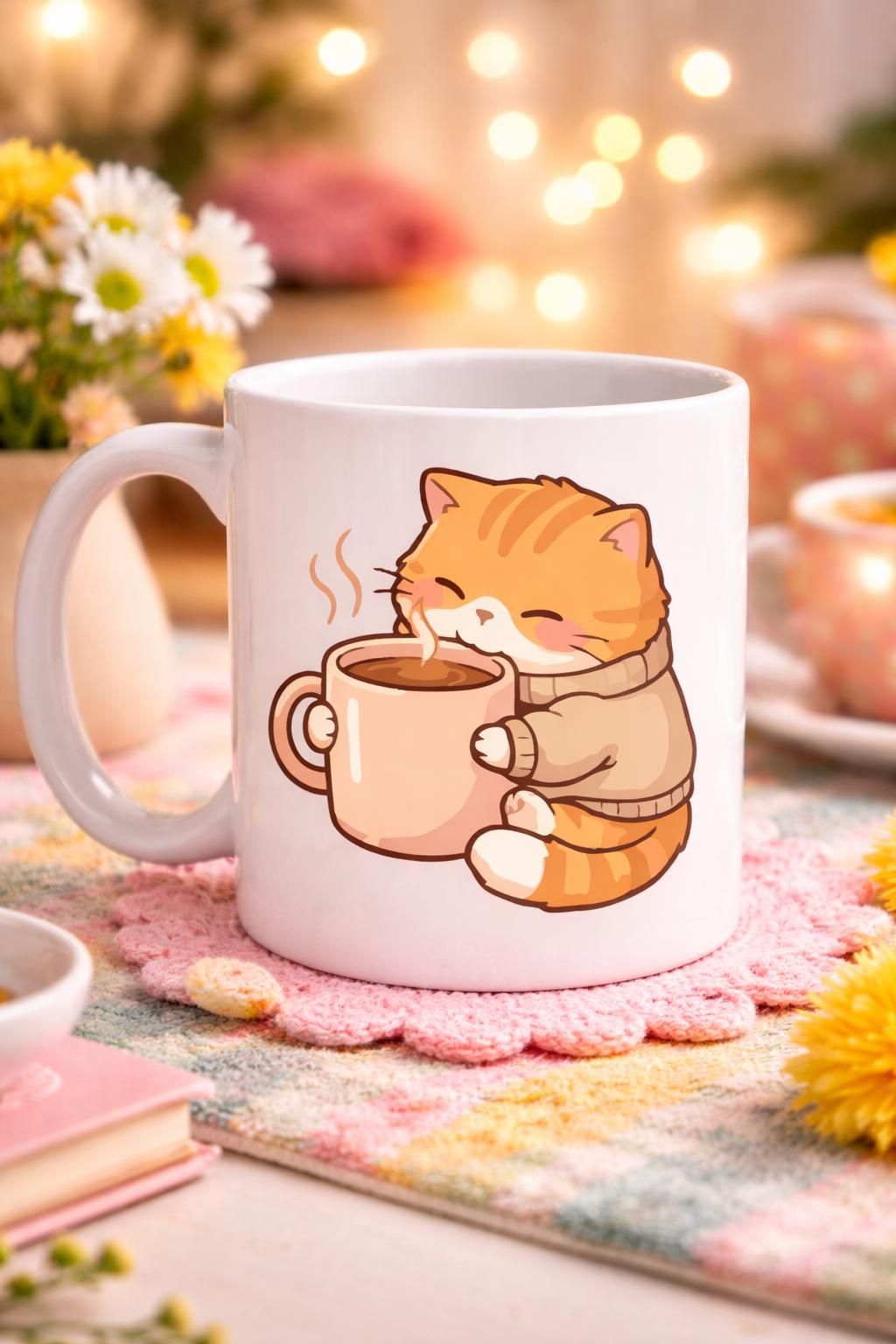 Bu sevimli porselen kupanın üzerinde, sıcacık kahvesini keyifle içen tatlı bir kedi yer alıyor. Üzerindeki yumuşacık kazak ve huzurlu gülümsemesi, tam da kış sabahlarının ve sakin kahve molalarının ruhunu yansıtıyor.