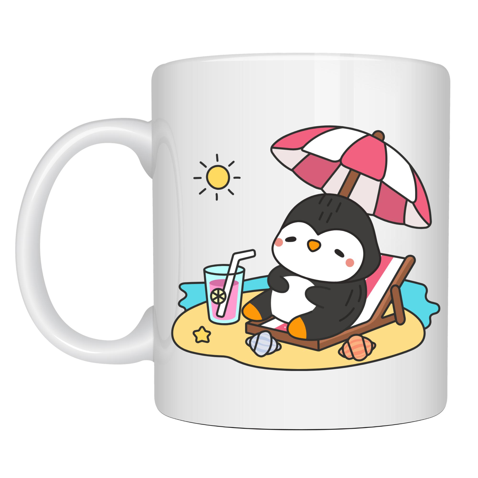 Sevimli Penguen Yaz Tatili Tasarımlı Porselen Kupa MODEL 200 – Penguen Baskılı Kahve Kupası – Yaz Temalı Eğlenceli Hediye Kupa
