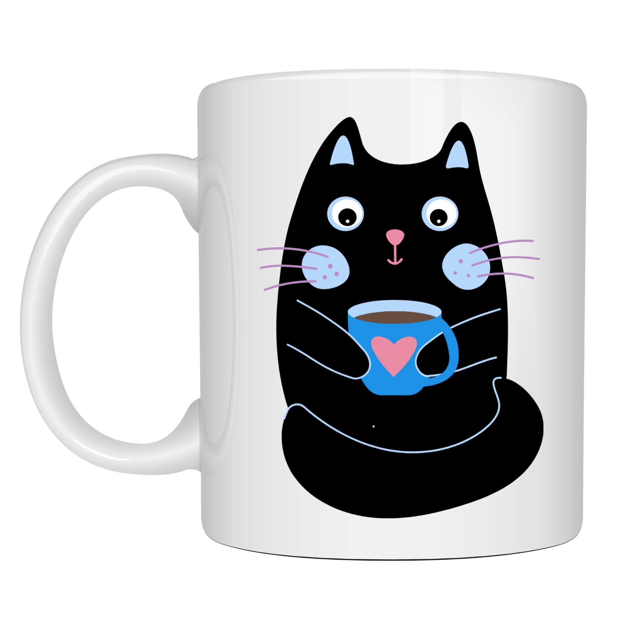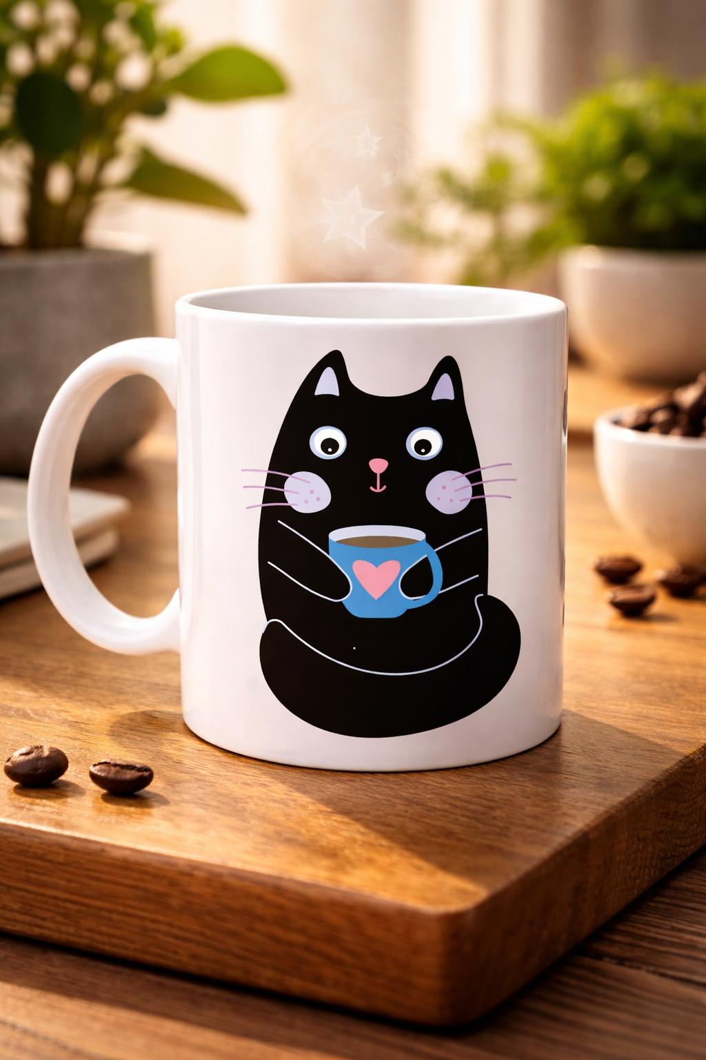 Tasarım: Kalp desenli kupa tutan sevimli siyah kedi